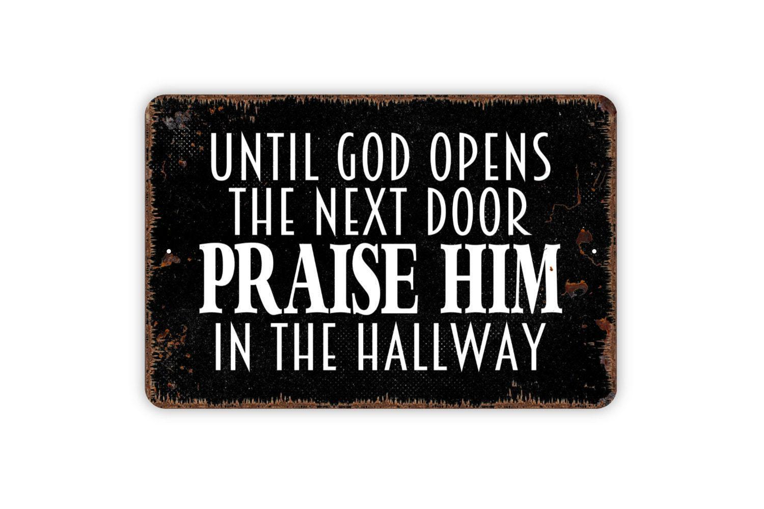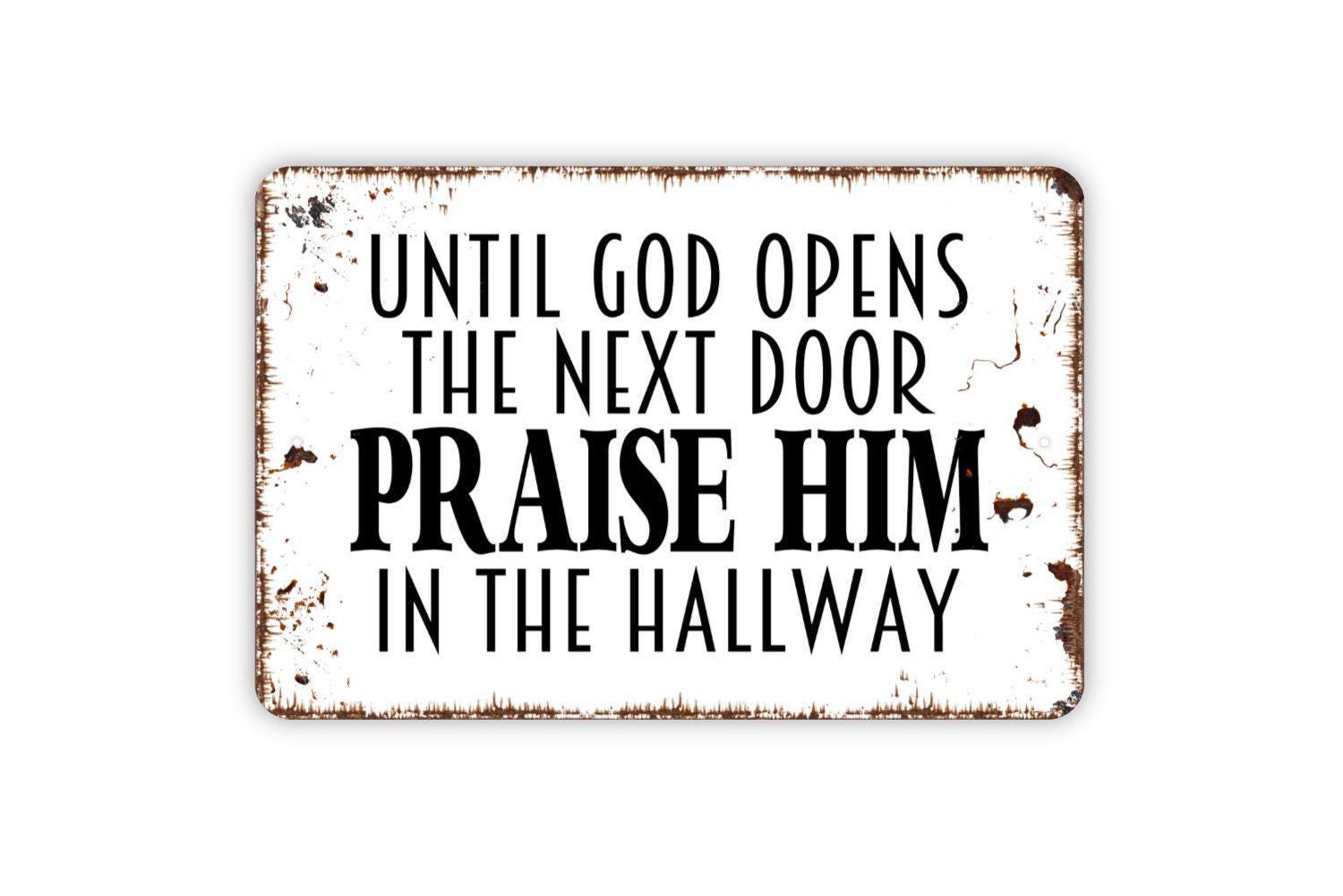 Until God Opens The Next Door Praise Him In The Hallway Sign - Christian Metal Indoor or Outdoor Wall Art