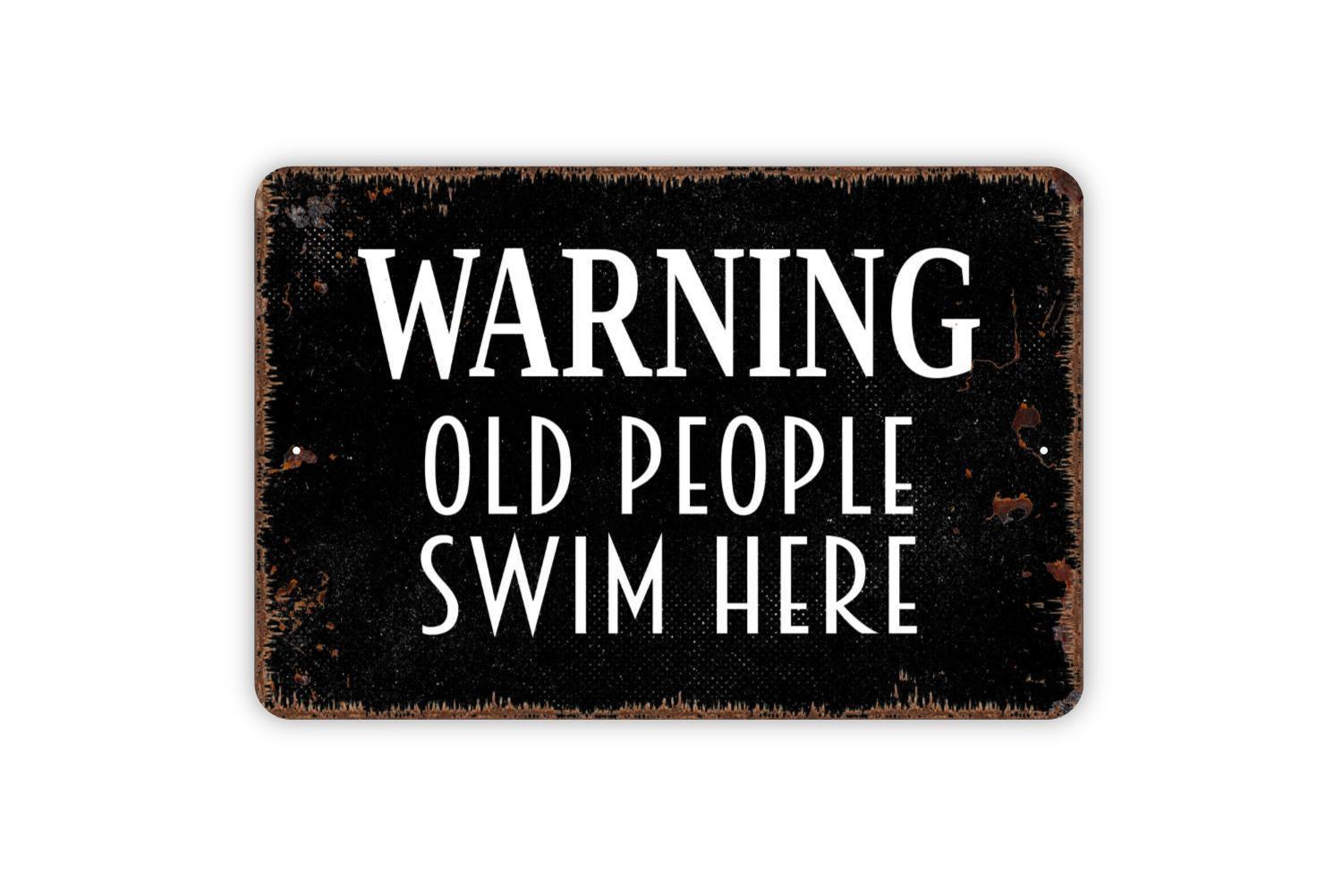 Warning Old People Swim Here Sign | Funny Pool Wall Decor | Rustic Swimming Pool Safety Humor Sign | Metal Sign or Vinyl Sticker