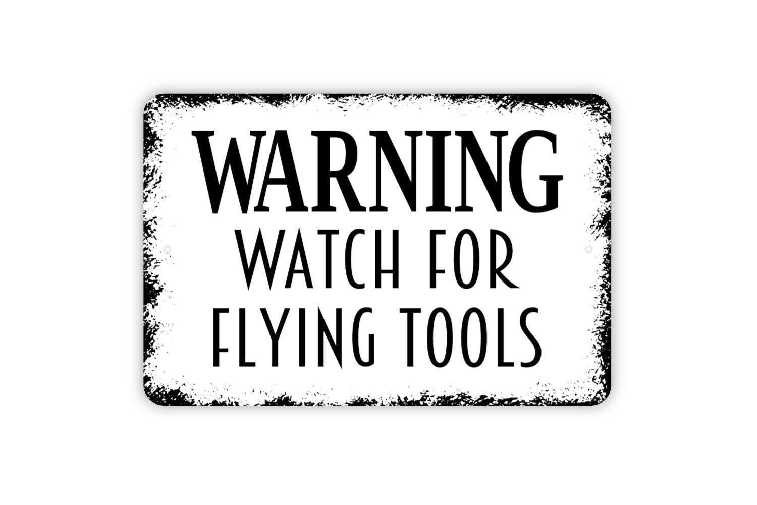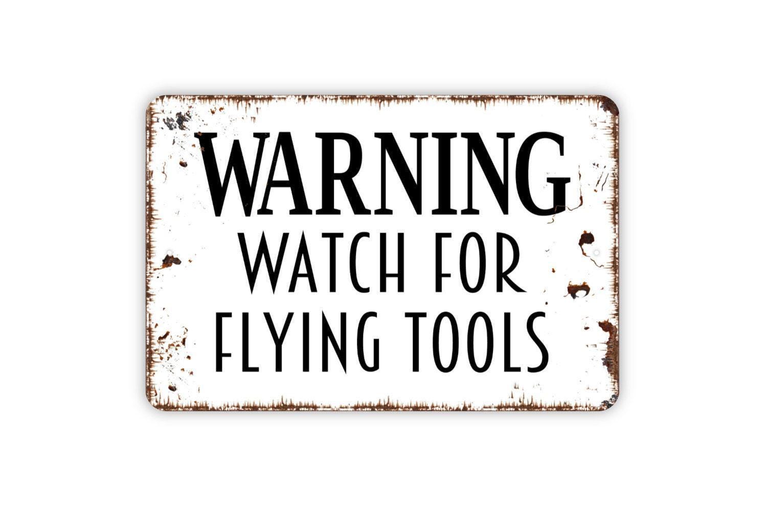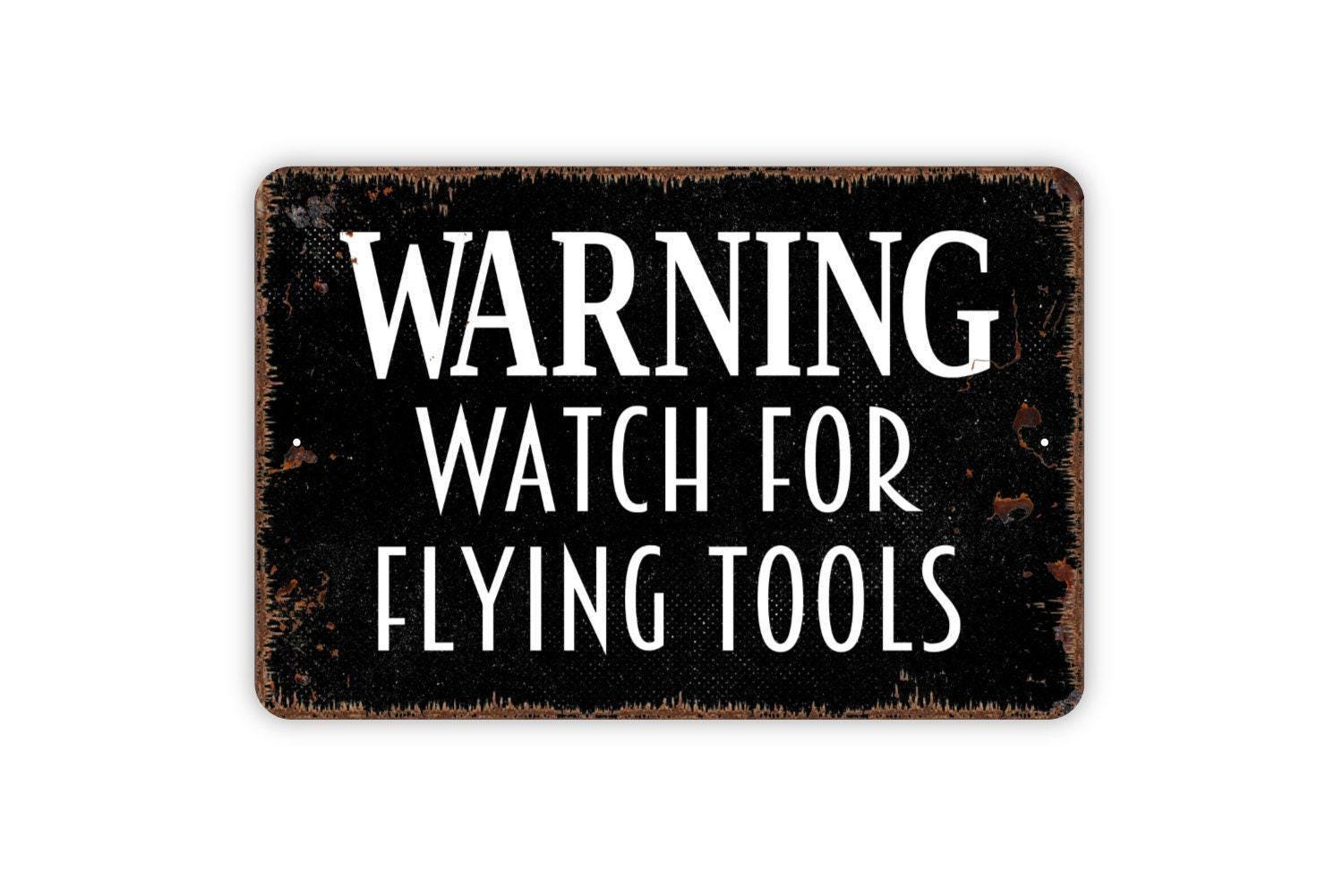 Warning Watch For Flying Tools Sign - Funny Garage or Workshop Metal Wall Art - Indoor or Outdoor