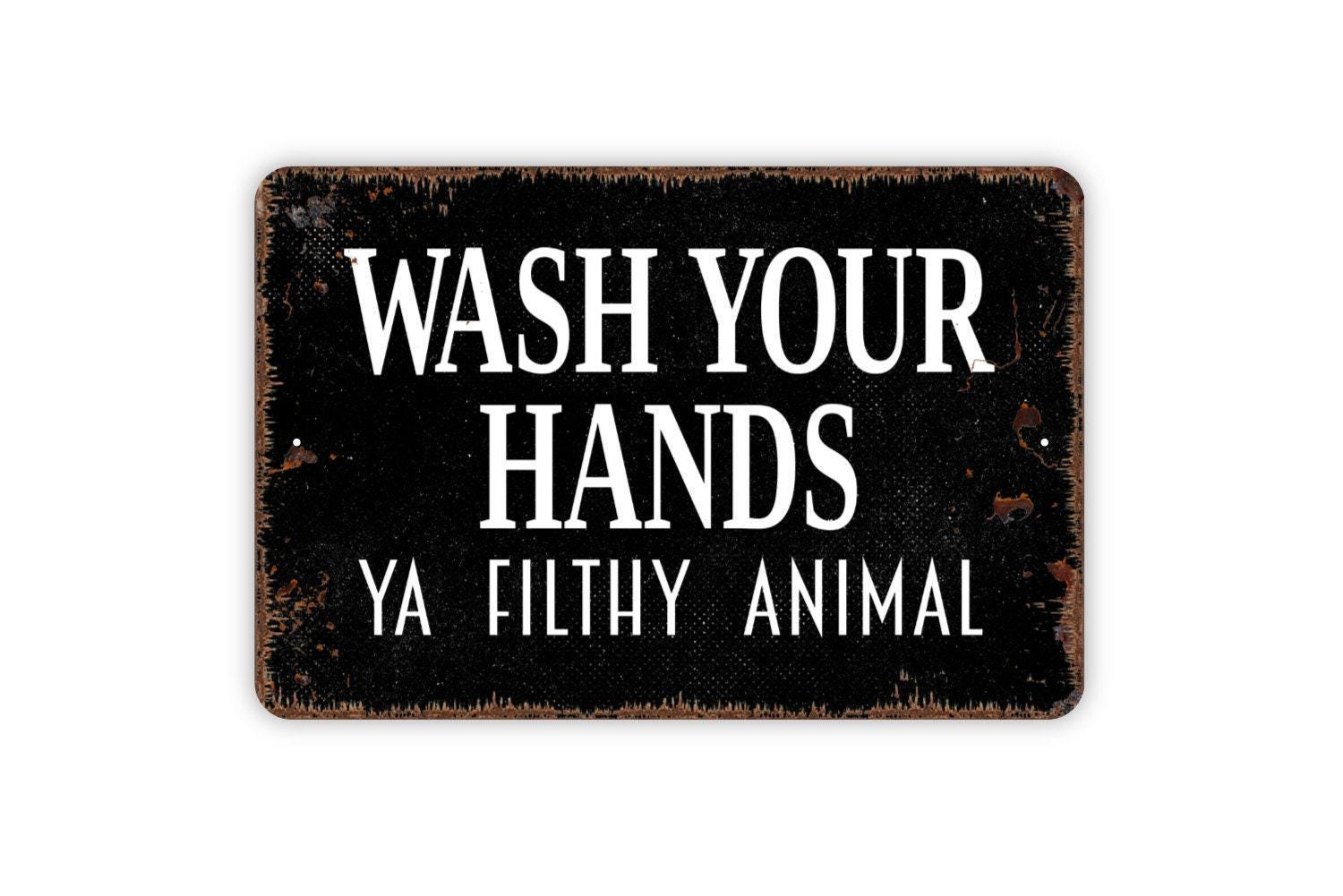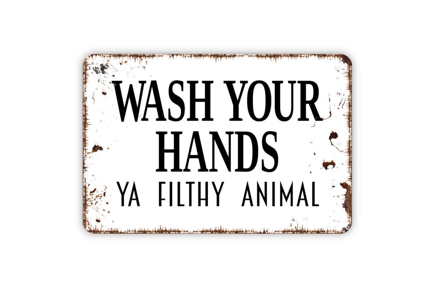 Wash Your Hands Ya Filthy Animal Sign – Funny Bathroom Rustic Farmhouse Wall Decor – Guest Restroom Humor Toilet Metal Sign or Sticker