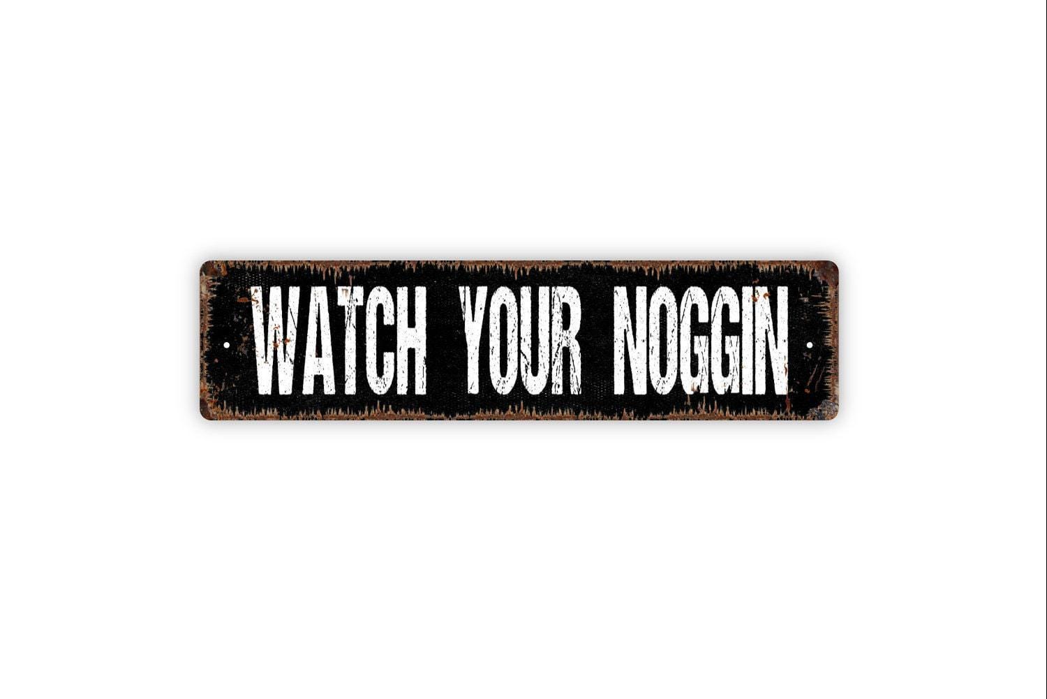 Watch Your Noggin Sign | Funny Safety Wall Decor | Metal Sign or Vinyl Sticker for Workplace, Warehouse, Garage, or Home