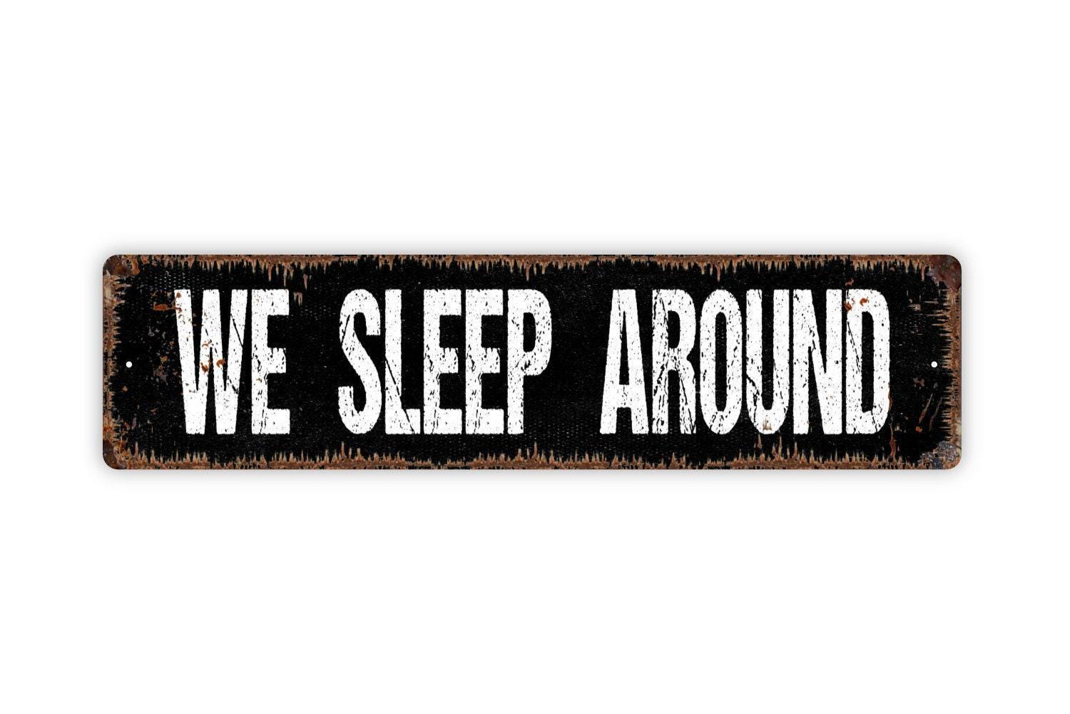 We Sleep Around Sign | Funny Camping Wall Decor | Metal Sign or Vinyl Sticker for RV, Camper, Cabin, or Campsite