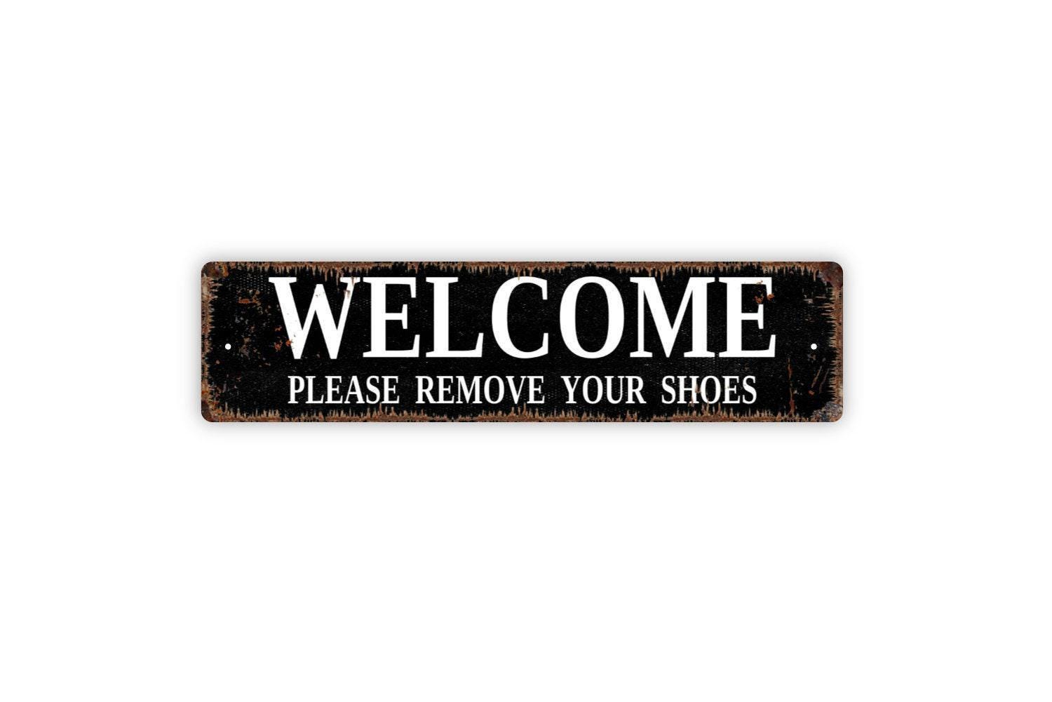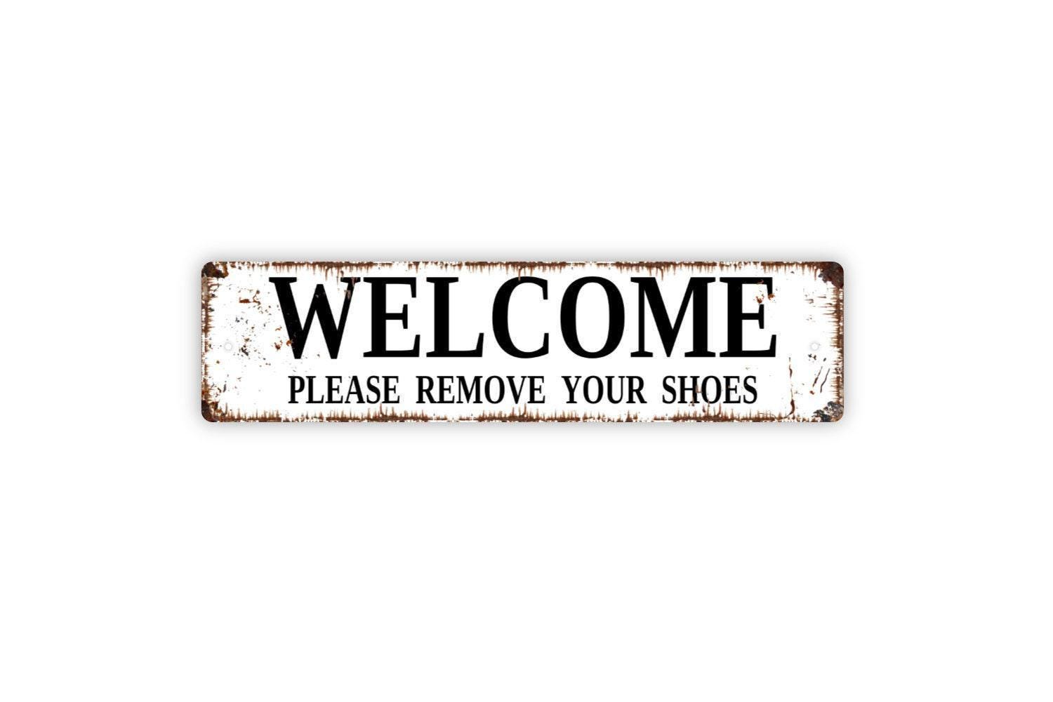 Welcome Please Remove Your Shoes Sign - Come On In No Shoes Allowed Vinyl Sticker Or Metal Street Sign or Door Name Plate Plaque