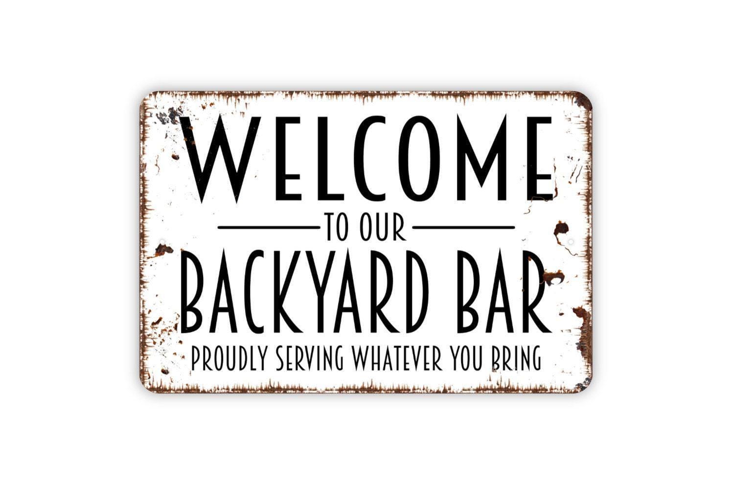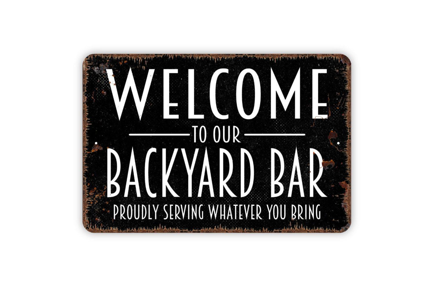 Welcome To Our Backyard Bar Proudly Serving Whatever You Bring Sign - Funny Metal Indoor or Outdoor Wall Art