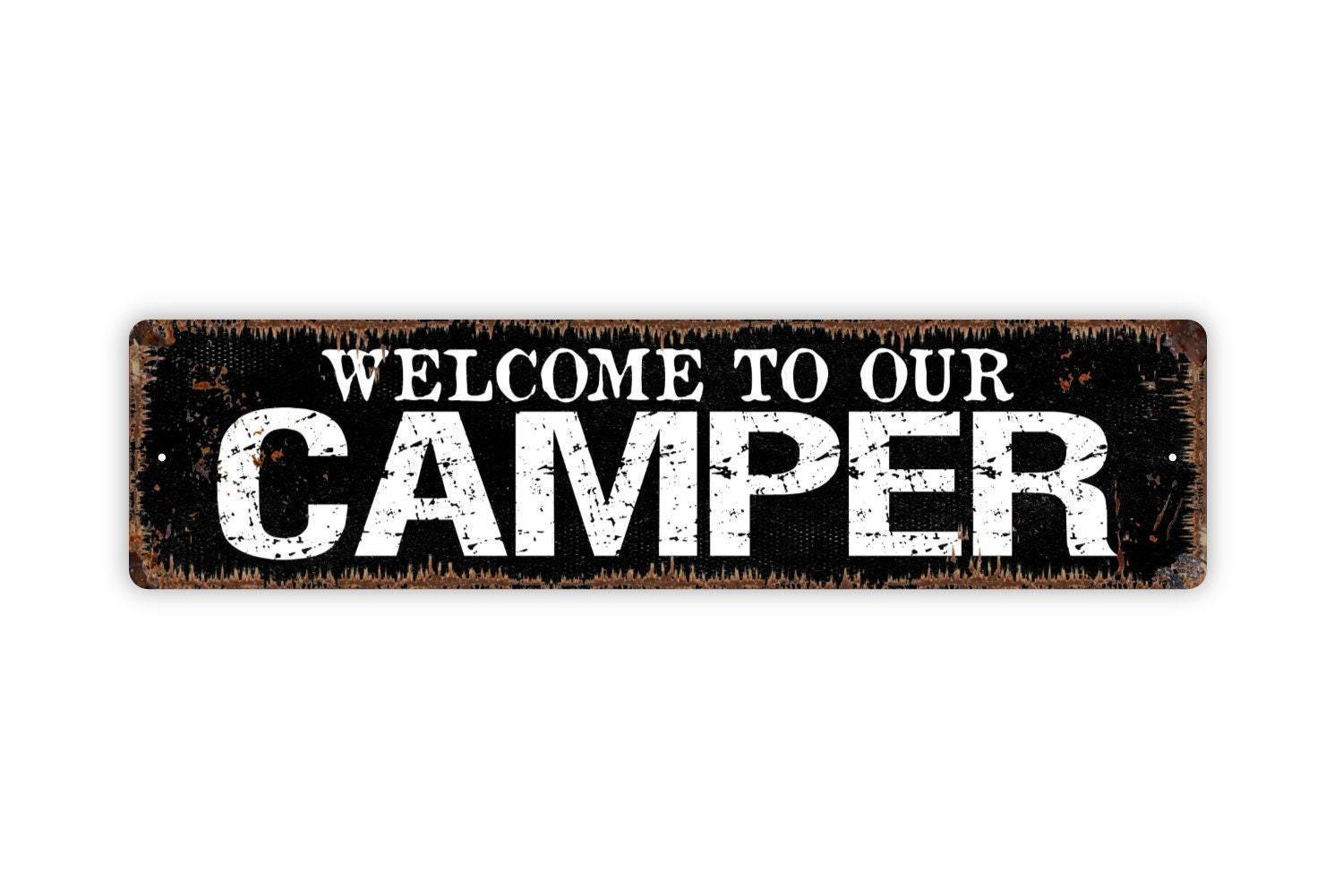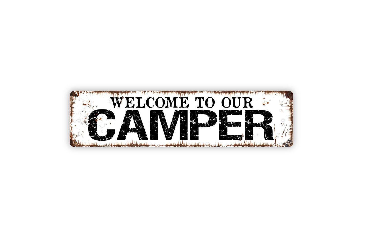 Welcome To Our Camper Sign - Campsite Camping Travel Trailer RV Vinyl Sticker Or Street Metal Sign or Door Name Plate Plaque
