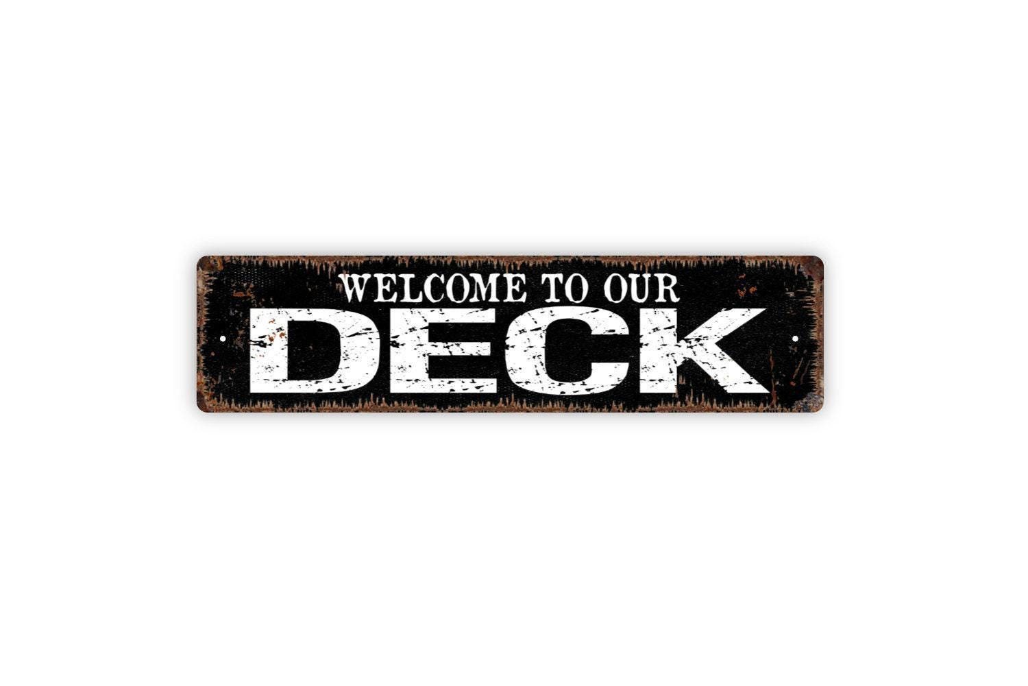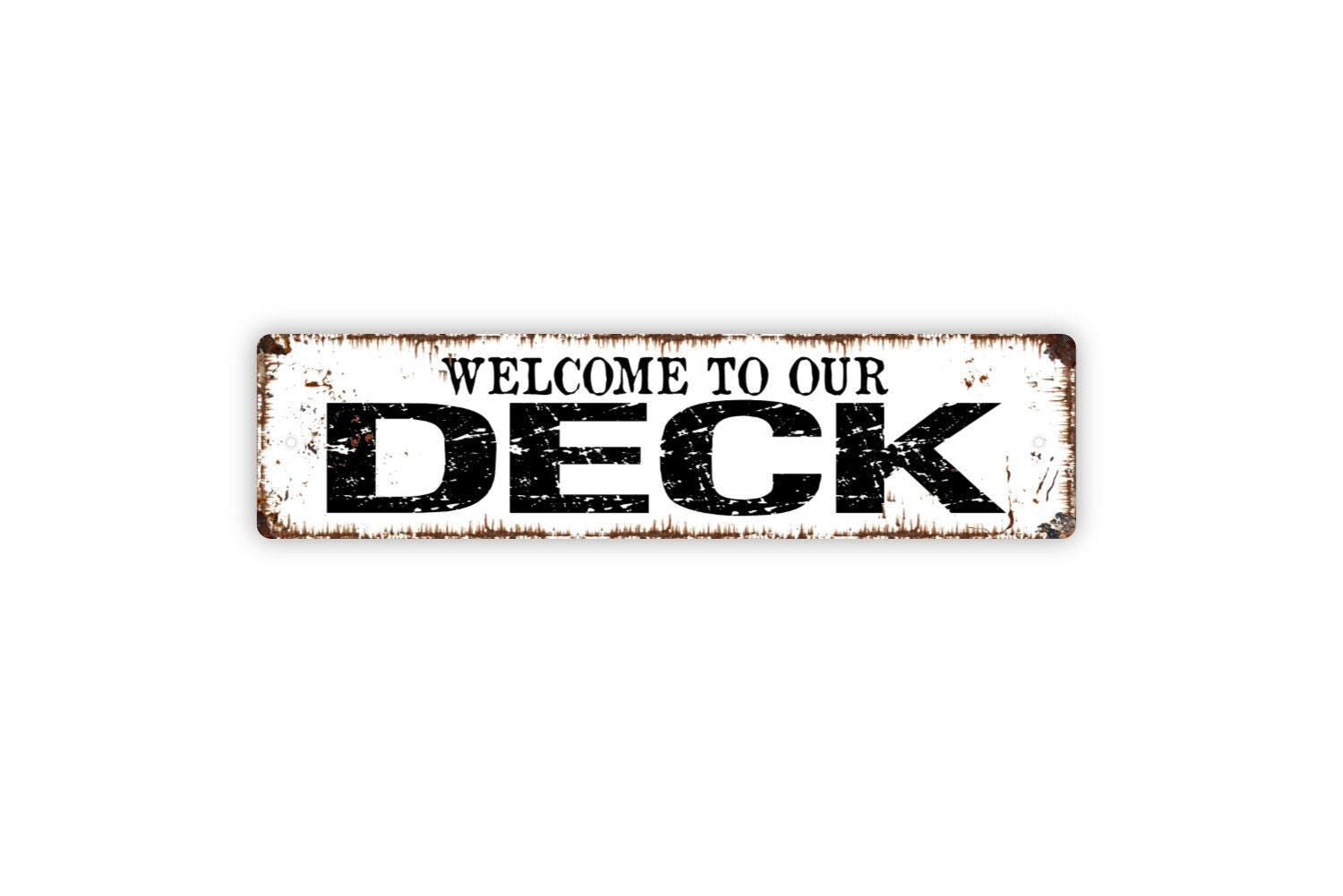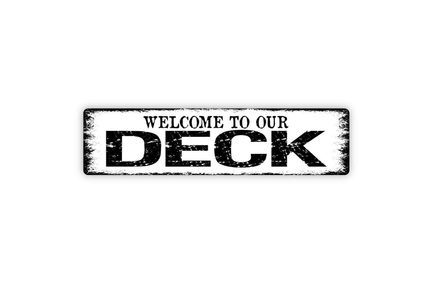 Welcome To Our Deck Sign - Distressed Vinyl Sticker Or Metal Street Sign or Door Name Plate Plaque Indoor Or Outdoor