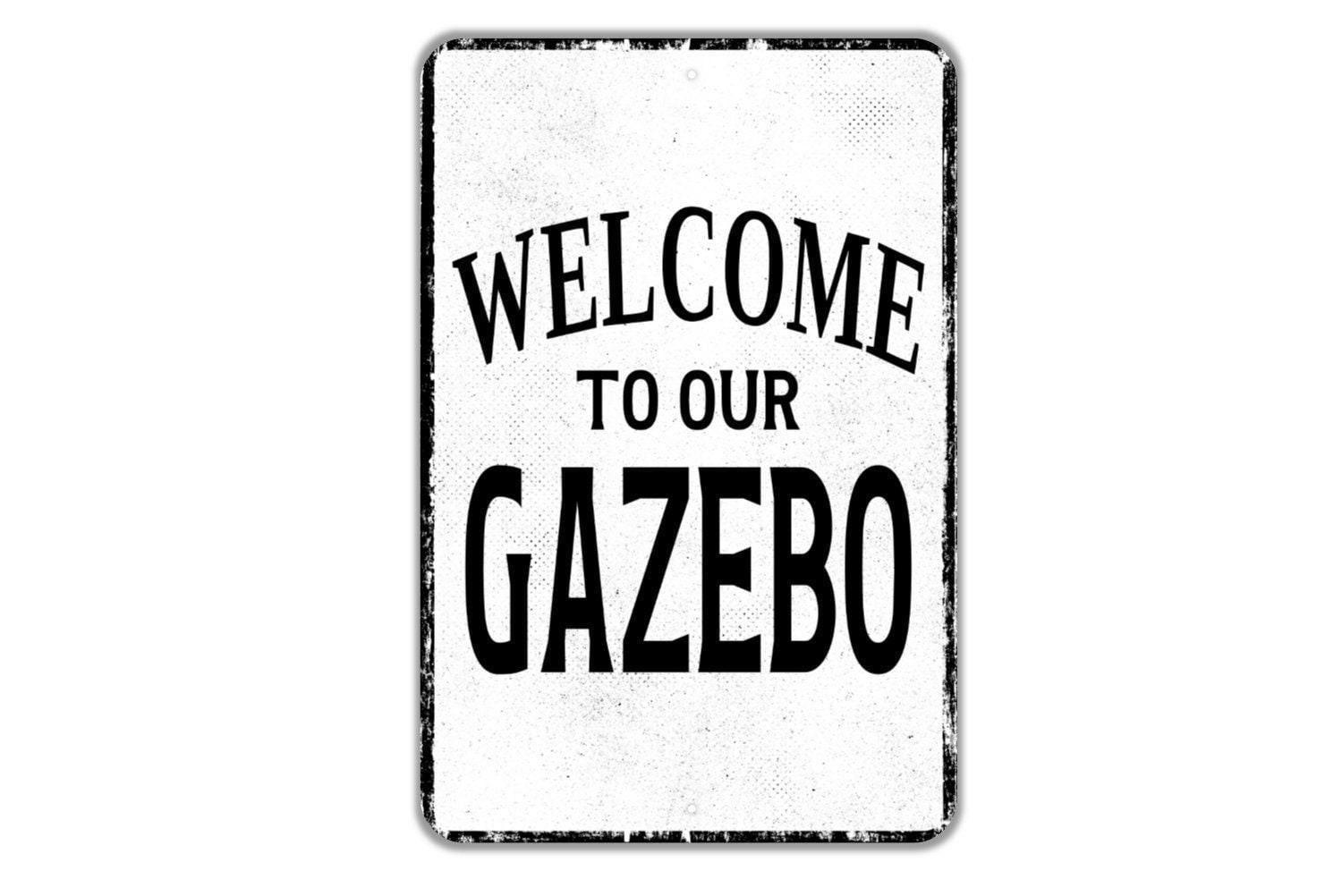Welcome friends and family with this Welcome To Our Gazebo Sign, available in multiple sizes as metal wall art or vinyl stickers. Perfect for gardens, patios, and backyards, this sign adds charm to any outdoor retreat or summer house. A thoughtful gift for homeowners, gardeners, or anyone who enjoys relaxing outdoors.