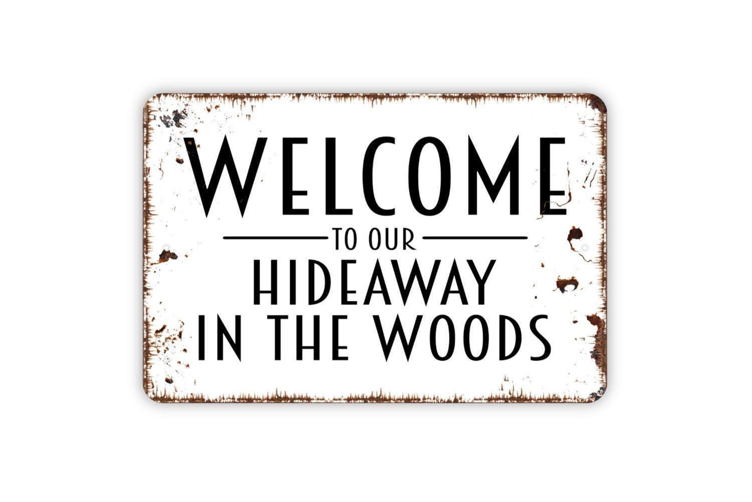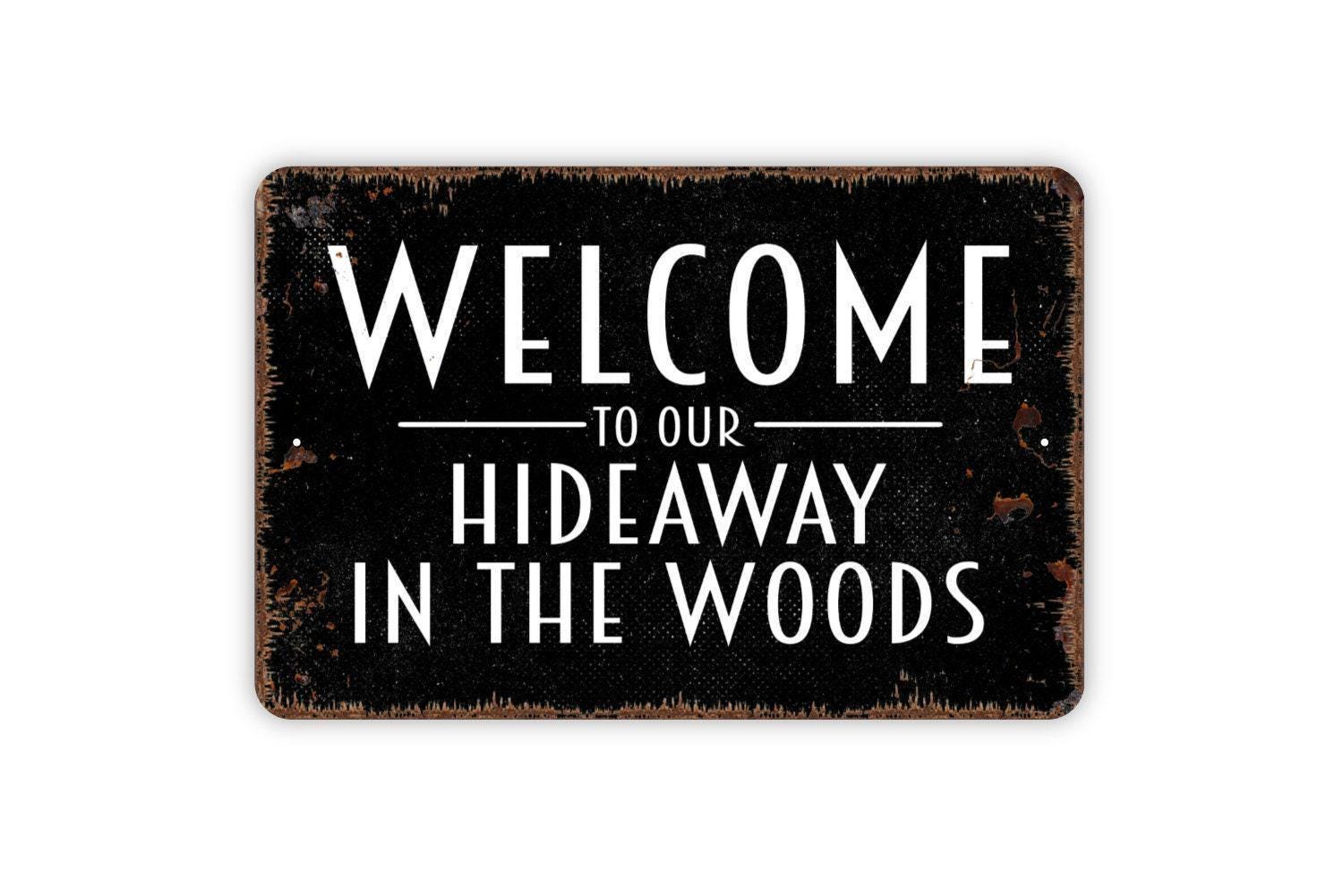 Welcome To Our Hideaway In The Woods Sign | Rustic Cabin Wall Decor | Lodge or Lake House Sign | Metal Sign or Vinyl Sticker | Country Home