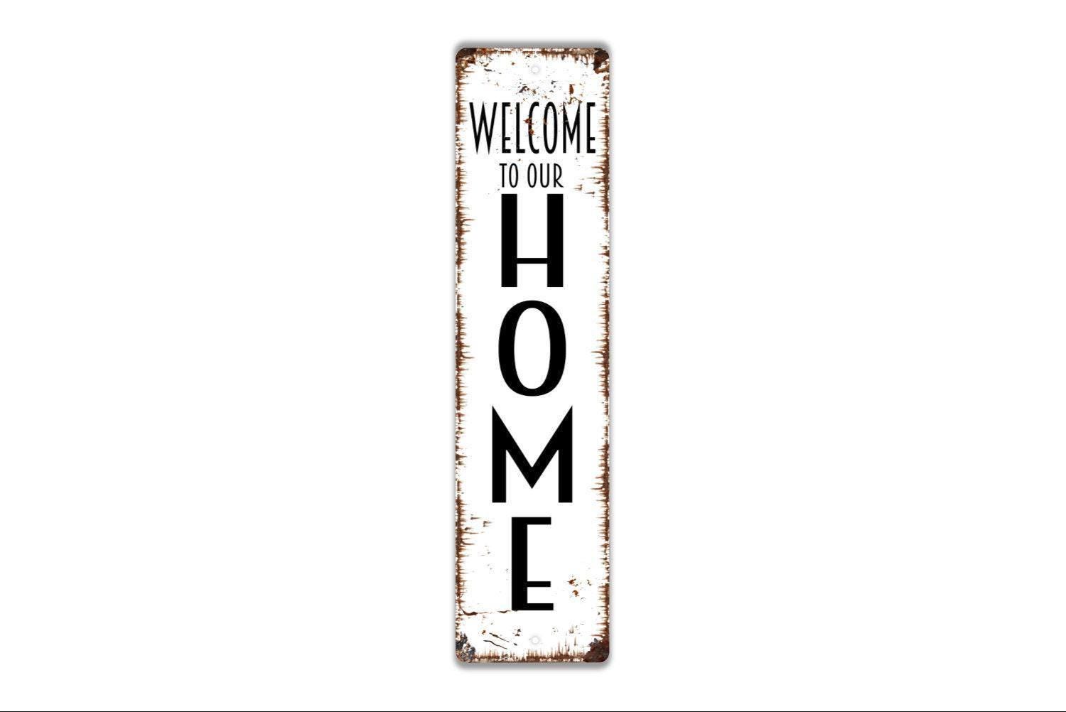 Welcome To Our Home Vertical Long Sign - Kitchen Living Room Porch Indoor Or Outdoor Rustic Street Metal Sign or Door Name Plate Plaque