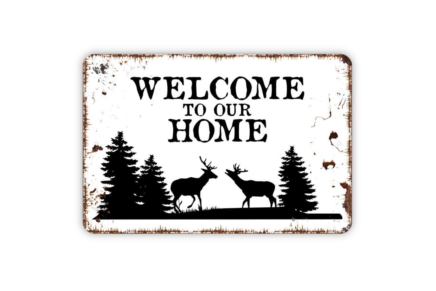 Welcome To Our Home With Buck Deer Scene Sign - Metal Indoor or Outdoor Wall Art