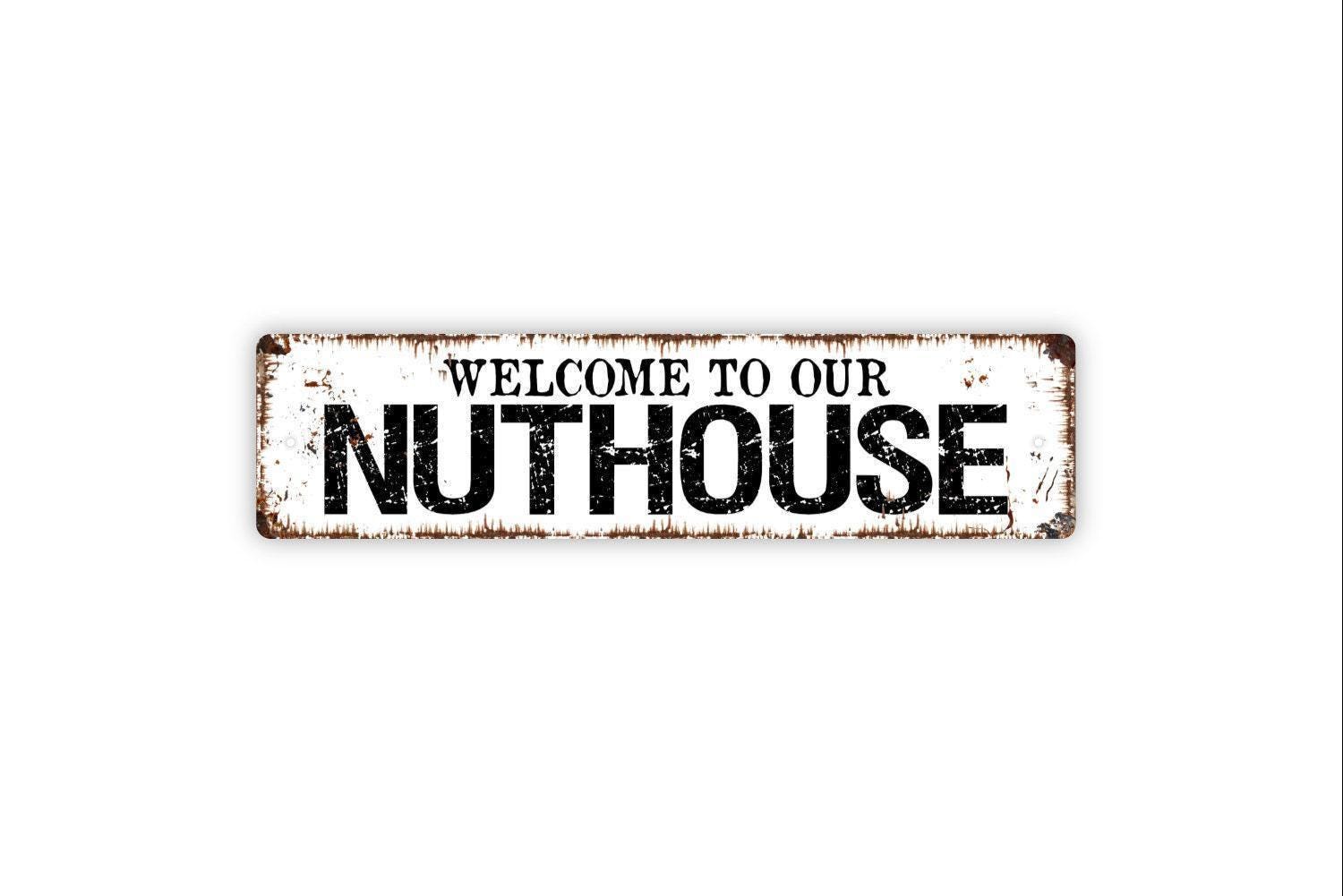 Welcome To Our Nuthouse Metal Sign - Squirrel Crossing Backyard Feeder Home Family Funny Rustic Street Metal Sign or Door Name Plate Plaque