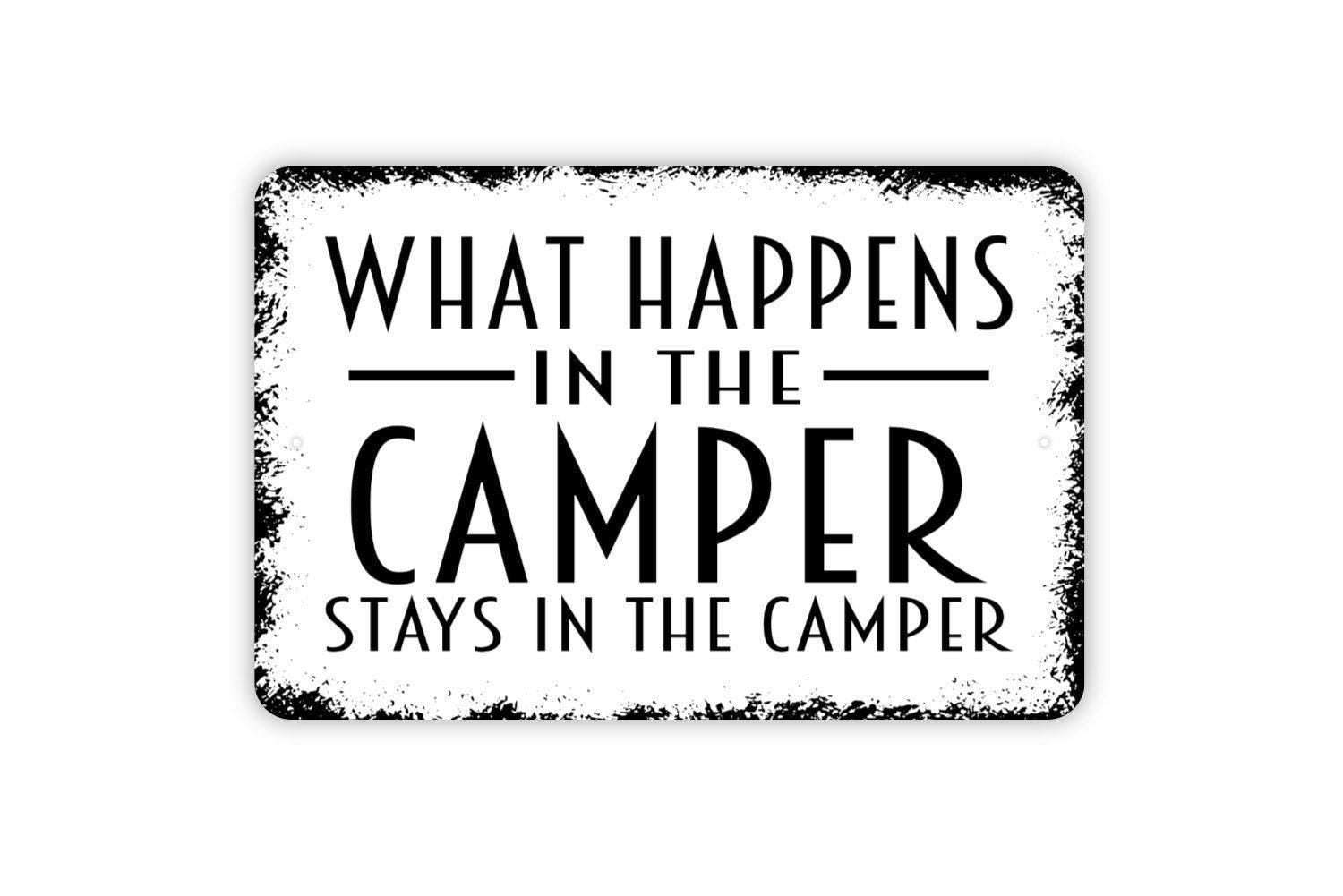 What Happens In The Camper Stays In The Camper Sign - Funny Camping Metal Wall Art - Indoor or Outdoor