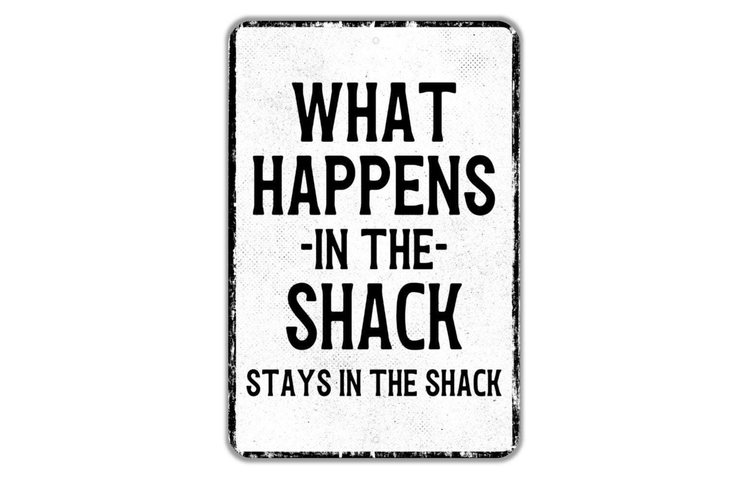 What Happens In The Shack Stays In The Shack Sign Metal Wall Art or Vinyl Sticker for Cabin, Lake House, Bar, Patio, Rustic Funny Decor