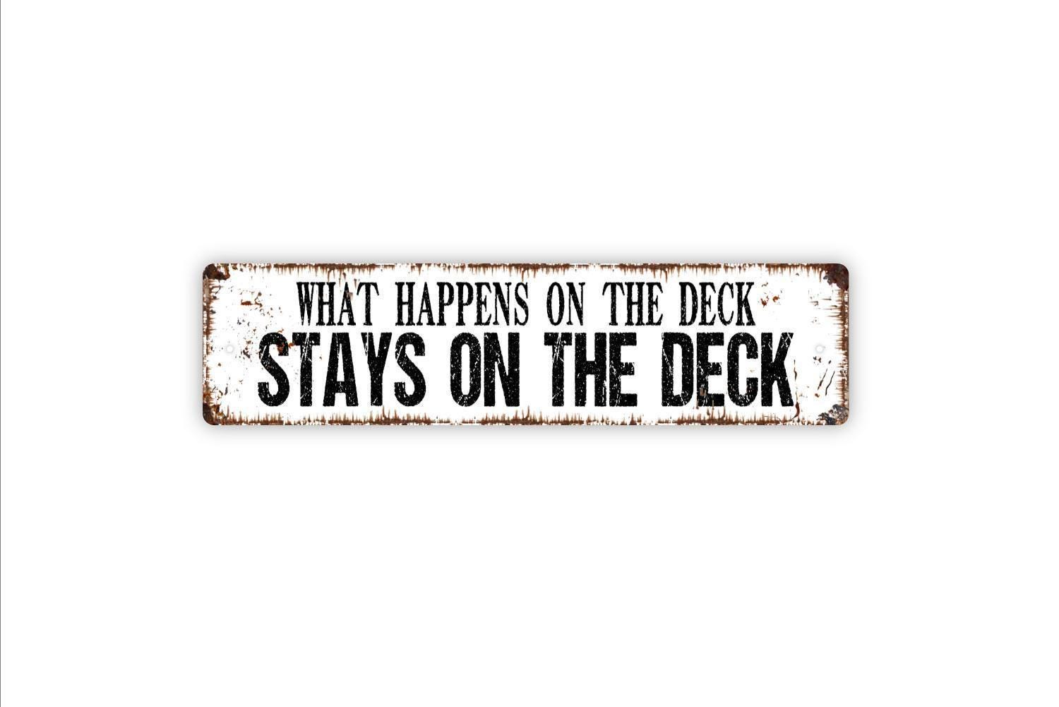 What Happens On The Deck Stays On The Deck Sign - Vinyl Sticker Or Metal Street Sign or Door Name Plate Plaque